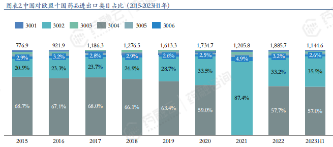 中国对欧盟十国药品进出口类目占比(2015-2023H1年)