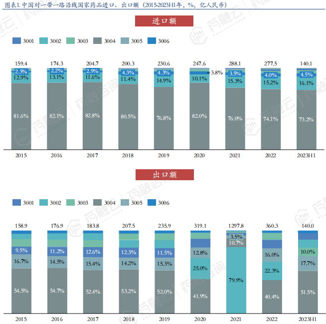 中国对一带一路国家药品进出口类目占比(2015-2023H1年,%,亿人民币)