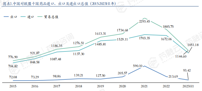 中国对欧盟十国药品进口、出口及进出口总值(2015-2023H1年)