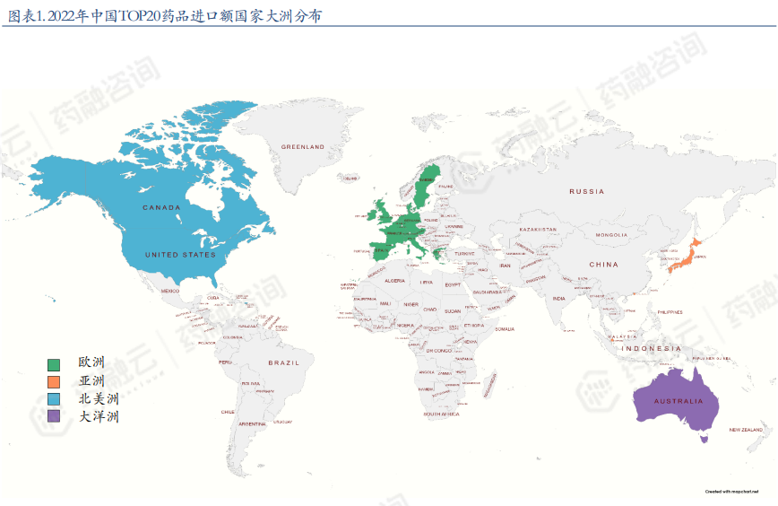 2022年中国TOP20药品进口额国家大洲分布