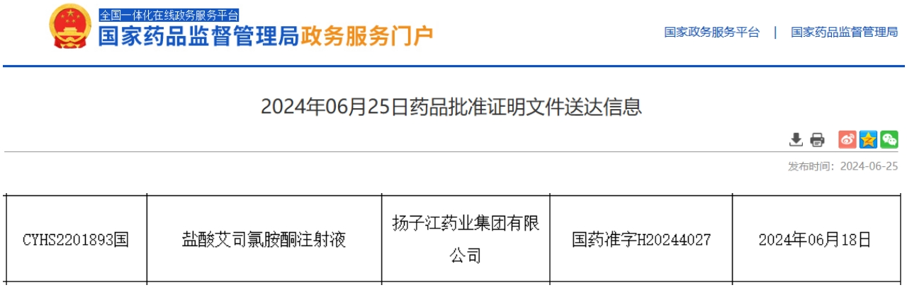 6月25日,据NMPA官网公示,扬子江药业提交的3类仿制药盐酸艾司氯胺酮注射液获批上市并视同过评。据药融云数据库显示,此前盐酸艾司氯胺酮注射液仅恒瑞一家药企拥有生产批文,此次扬子江药业是第2家获批该品种的药企。