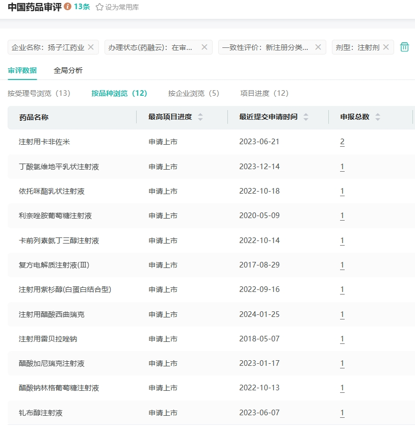 2024年至今,扬子江药业有盐酸艾司氯胺酮注射液、阿加曲班注射液、他氟前列素滴眼液、吸入用乙酰半胱氨酸溶液等9个品种获批并过评。