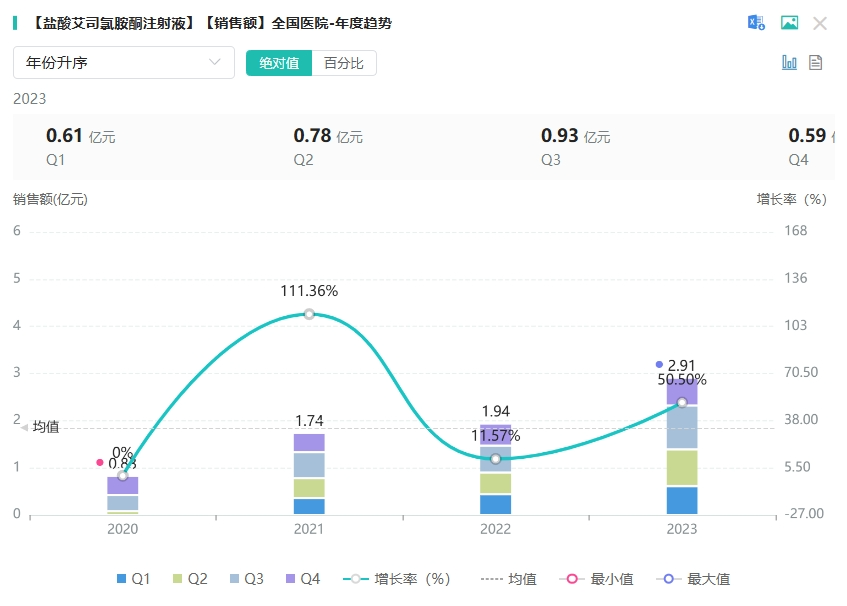 盐酸艾司氯胺酮注射液限用于手术镇痛镇静和重度抑郁症的治疗,或用于与镇静麻醉药(如丙泊酚)联合诱导和实施全身麻醉。2020年经谈判进入国家医保目录。据药融云数据库显示,盐酸艾司氯胺酮注射液在2022年全国医院内的销售额已接近2亿元,同比增长达11.57%。进入2023年,该品种在全国院内销售额逼近3亿元,同比增长达50.50%,市场潜力可期。