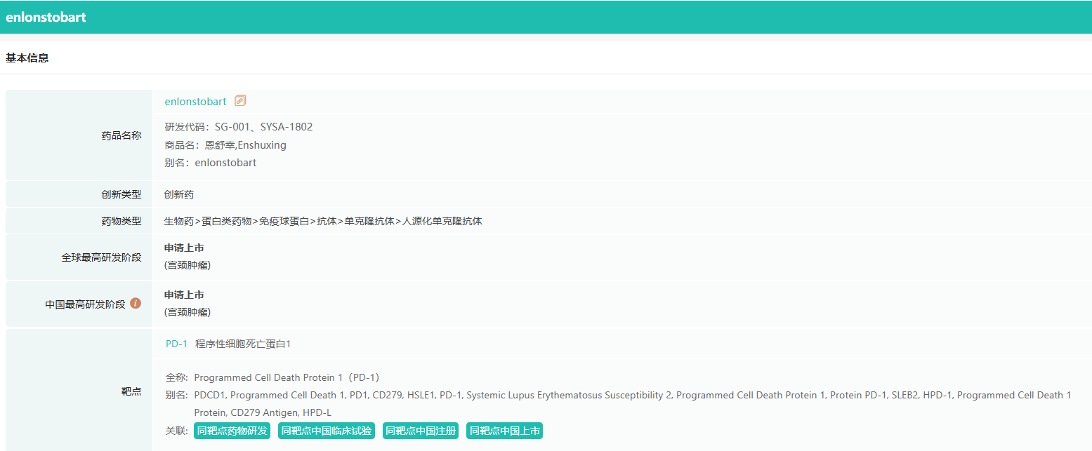 恩朗苏拜单抗注射液是重组抗PD-1全人源单克隆抗体,属IgG4型单抗药物,通过靶向人类程序性细胞死亡蛋白-1(PD-1),逆转PD-1通路介导的抑制免疫反应,从而激活机体抗肿瘤免疫反应。该产品本次获批的适应症是用于治疗既往接受含铂化疗治疗失败的PD-L1表达阳性(CPS≥1)的复发或转移性宫颈癌患者。本次获批主要是基于一项关键II期临床试验,入组患者为既往接受过至少一线含铂方案化疗失败的PD-L1表达阳性的复发或转移性宫颈癌患者(其中36.5%既往接受了≥2线全身治疗)。结果显示该产品治疗晚期宫颈癌显著提高了客观缓解率(ORR),独立影像评估委员会评估的ORR达29%,包括2例完全缓解和29例部分缓解,中位缓解持续时间为16.6个月。同时,该产品的安全性良好。