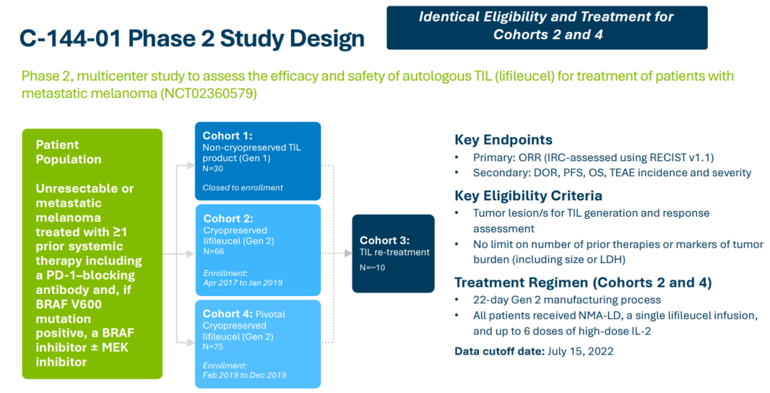 lifileucel此次MAA基于C-144-01临床试验的积极临床数据的支持。C-144-01是一项开放标签、多队列、多中心的2期临床试验,目的为检视单次注射lifileucel在接受PD-1/PD-L1抑制剂治疗期间或之后出现疾病进展的晚期黑色素瘤患者身上的疗效与安全性。