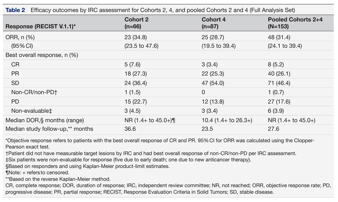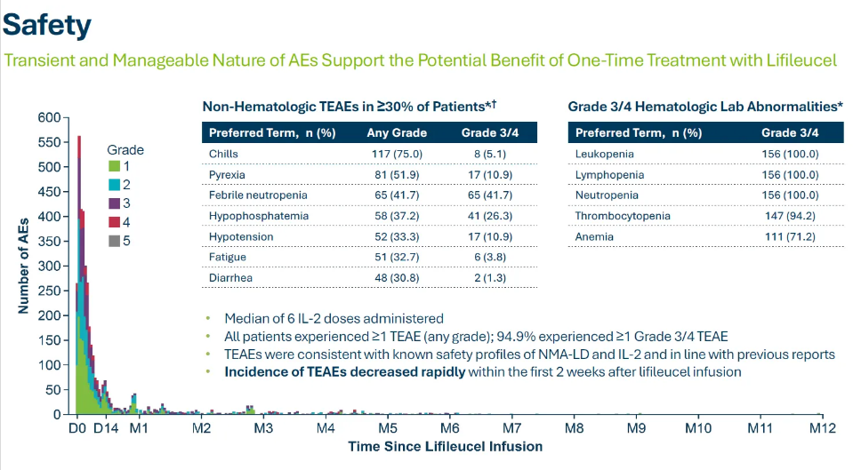 根据之前公布的试验结果,lifileucel展现持久的临床益处,中位随访时间为27.6个月时,在经过大量预治疗的患者中,独立审评委员会(IRC)评估的客观缓解率(ORR)为31.4%(95% CI:23.5-47.6),其中包含8位患者达完全缓解(CR)与40位患者达部分缓解(PR)。