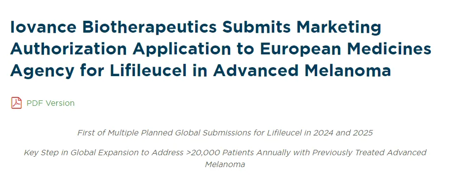 2024年6月28日,Iovance Biotherapeutics向欧洲药品管理局(EMA)递交了TIL细胞疗法lifileucel的上市许可申请(MAA),用于治疗曾接受过PD-1阻断抗体治疗的不可切除或转移性黑色素瘤成人患者(如果BRAF V600基因突变阳性,接受过 BRAF抑制剂±MEK抑制剂治疗)。如果获得批准,lifileucel将成为欧盟(EU)所有成员国中首个也是唯一一个获准用于此类疾病的疗法。