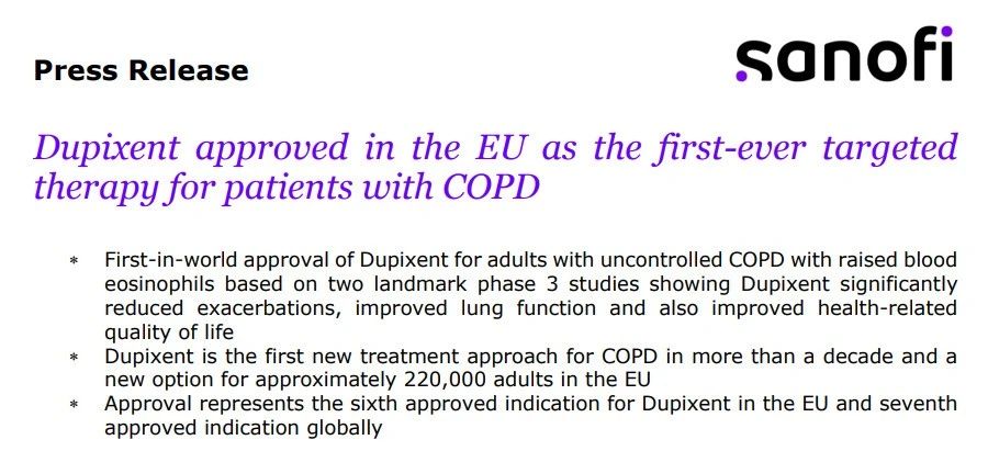 7月3日,赛诺菲和再生元联合宣布,度普利尤单抗(dupilumab,商品名:Dupixent)已获欧洲药品管理局(EMA)批准,主要用于治疗血液嗜酸性粒细胞升高且未得到控制的COPD(慢性阻塞性肺病)成人患者。
