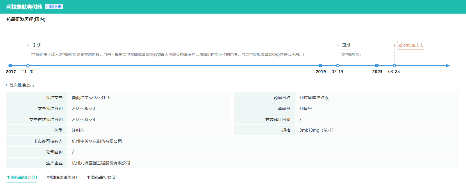 在国内市场,2023年3月30日,华东医药的利拉鲁肽类似药“利鲁平”成功获得上市许可,成为首款获批的国产治疗糖尿病的利拉鲁肽注射液,为企业赢得了市场先机。同年12月4日,通化东宝的利拉鲁肽注射液(商品名:统博力)也顺利获得药监局批准,适应症为2型糖尿病,这标志着国内第二款国产利拉鲁肽注射液的诞生,同时也是通化东宝在GLP-1受体激动剂领域的首次突破。