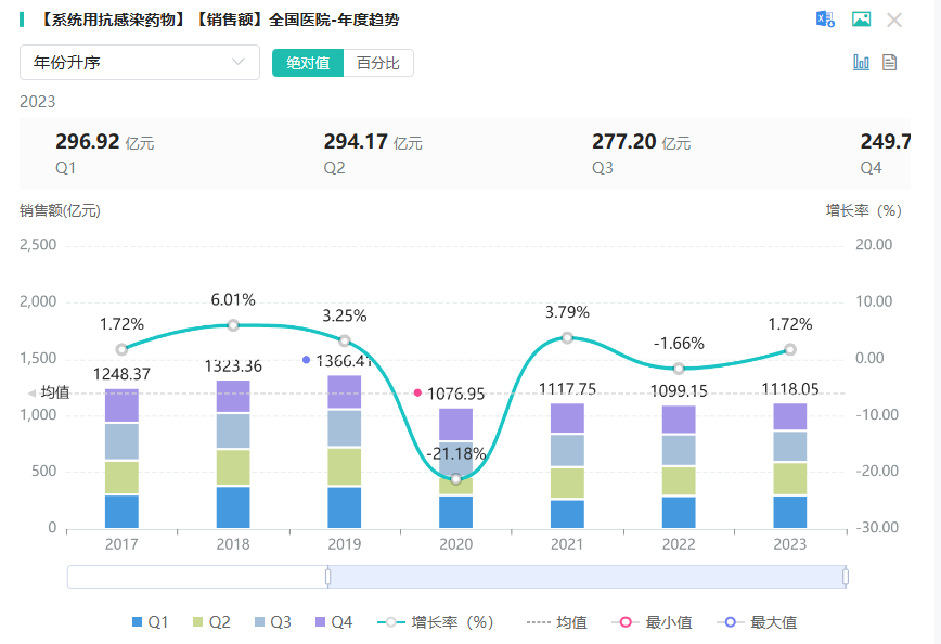 头孢地尼胶囊、头孢地尼颗粒、注射用盐酸头孢替安、头孢克洛干混悬剂均为系统用抗感染药物,据药融云数据库显示,2023年系统用抗感染药物(化学药或生物药)在全国院内市场销售额超1千亿元,同比增长达1.72%。其中头孢地尼胶囊、注射用盐酸头孢替安、头孢克洛干混悬剂在2023年全国院内销售额分别为1.7亿元,6.06亿元,3.81亿元。