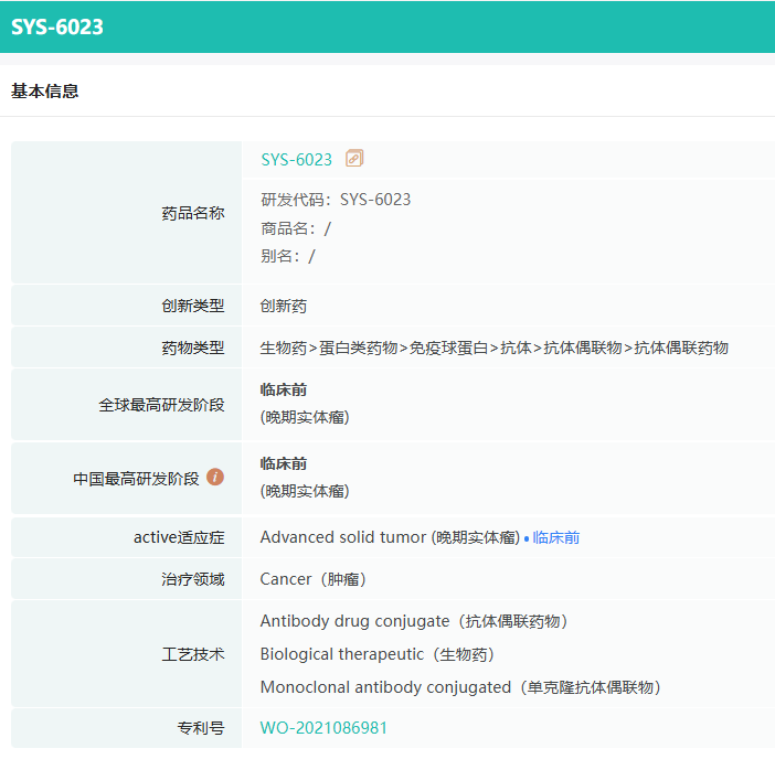 SYS6023是一款单克隆抗体药物偶联物,可与肿瘤表面的特异性受体结合,通过内吞作用进入细胞并释放毒素,达到杀伤肿瘤细胞的作用。据药融云数据库显示,本次获批临床的适应症为晚期实体瘤,临床前研究显示该产品对多种癌症均显示有较好的抗肿瘤作用,具备较高的临床开发价值。该产品已提交多项专利申请。
