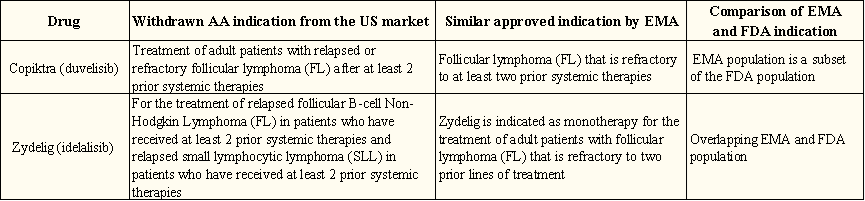 以Duvelisib为例看下它在美国加速审批/撤回和欧盟上市许可的批准情况: