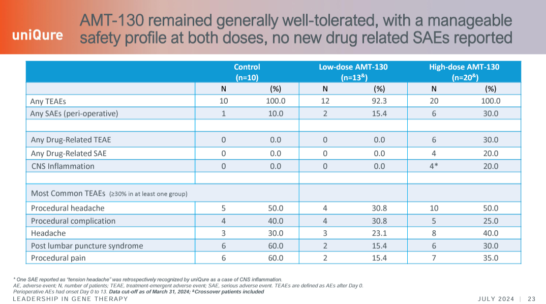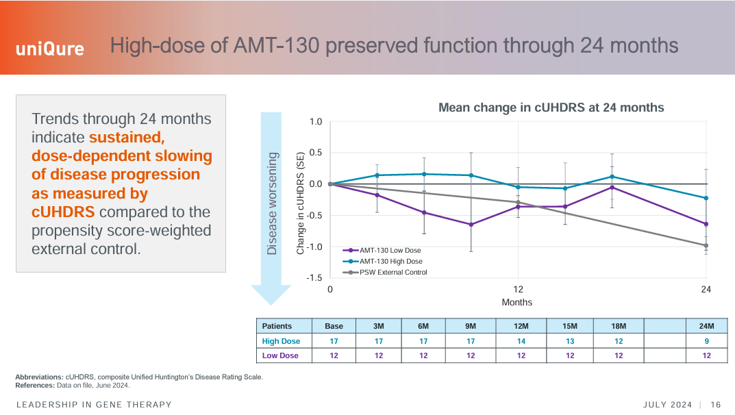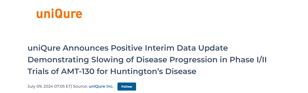 [1] https://www.globenewswire.com/news-release/2024/07/09/2910220/0/en/uniQure-Announces-Positive-Interim-Data-Update-Demonstrating-Slowing-of-Disease-Progression-in-Phase-I-II-Trials-of-AMT-130-for-Huntington-s-Disease.html