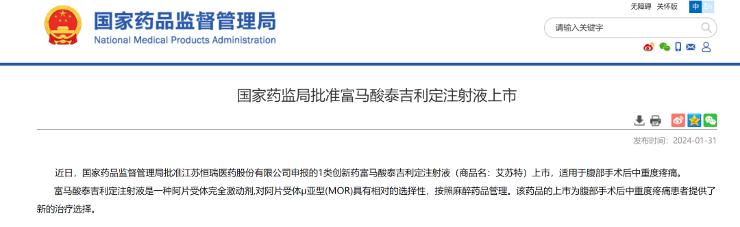 据药融云数据显示:2024年1月31日,国家药品监督管理局(NMPA)发布的公告,江苏恒瑞医药股份有限公司自主研发的国内首个1类阿片类镇痛新药—富马酸泰吉利定注射液(商品名:艾苏特®)在我国获批上市。