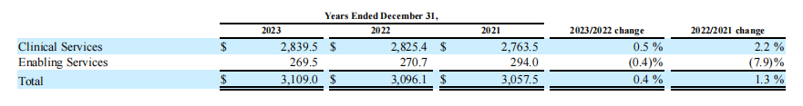2023年度,Fortrea公布了公司近几年临床服务和赋能服务部门的收入情况,2023年度公司收入为31.09亿美元,临床服务的收入为28.395亿美元,赋能服务的收入为2.695亿美元。与2022年的30.96亿美元相比增长了0.4%。收入的增加是由于0.3%的有机增长和0.1%的有利外币折算。