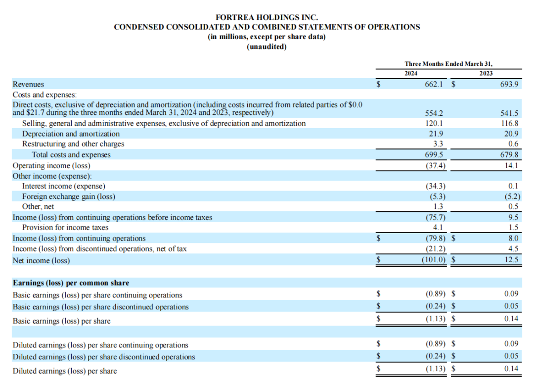 由于Fortrea已经剥离了赋能服务部门,于是2024年第一季度报道的营收情况公司所有持续经营的综合收入都来自临床服务部门。2024年第一季度收入为6.621亿美元,上年同期为6.939亿美元;GAAP持续经营净亏损为8160万美元,每股摊薄亏损为0.91美元;调整后EBITDA为2950万美元,而上年同期调整后EBITDA为4170万美元。截至2024年3月31日,积压订单为74亿美元,2024年第一季度的订单出货比为1.11倍。