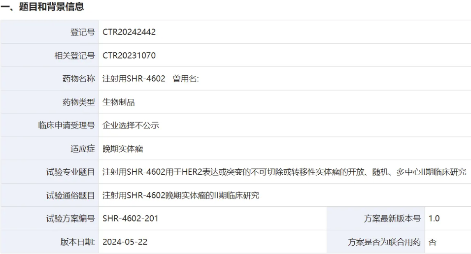2024年7月9日,恒瑞医药在药物临床试验登记与信息公示平台网站注册了SHR-4602的二期临床试验。