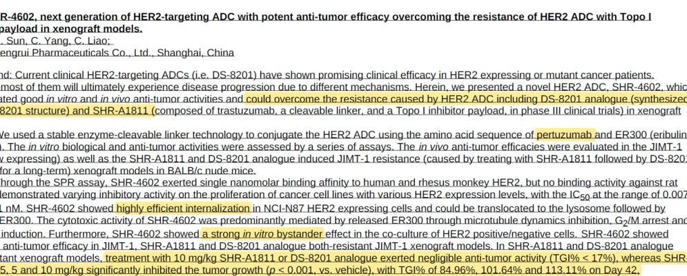 2024年,恒瑞在AACR上展示了HER2 ADC新药 SHR-4602的临床前数据。SHR-4602选用帕妥珠作为偶联抗体,具有良好的体外杀伤活性、内吞活性和旁观者效应,且在DS-8201 及SHR-A1811耐药的JIMT-1体内药效模型上表现出良好抑瘤活性,SHR-4602的设计目标是用于DS-8201以及恒瑞医药“前代”HER2 ADC产品SHR-A1811耐药的后线治疗。SHR-4602已于2023年4月获批临床。
