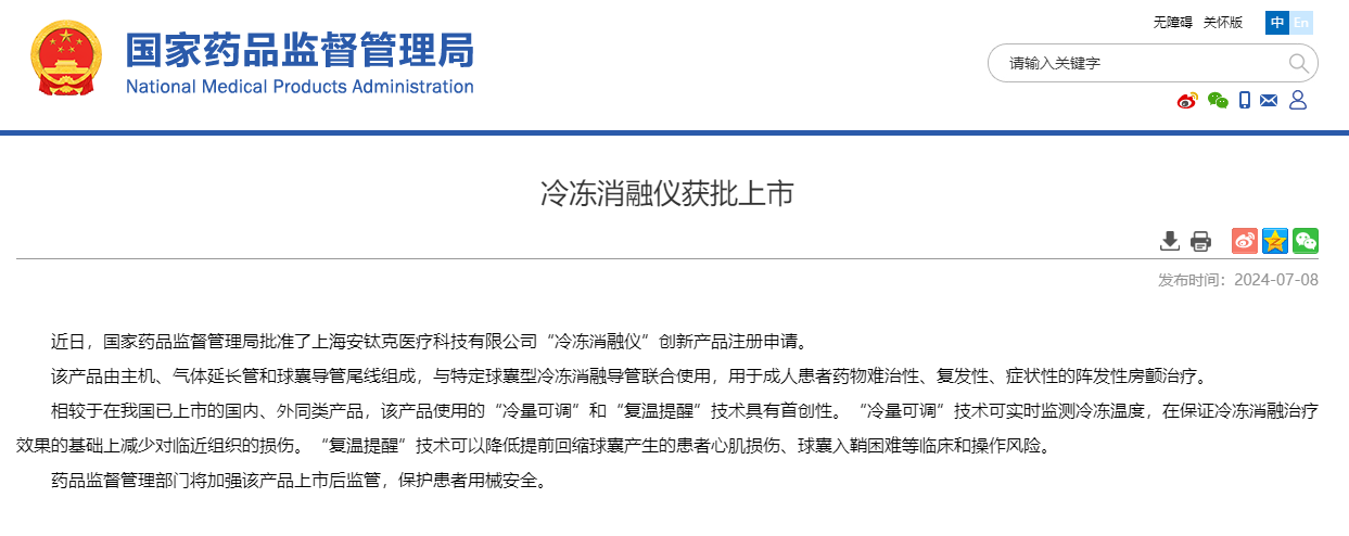 近日,国家药品监督管理局批准了上海安钛克医疗科技有限公司“冷冻消融仪”创新产品注册申请。这是上海市今年第2款获批的Ⅲ类创新医疗器械,也是其第三家自主研发的冷冻消融创新产品获批上市。