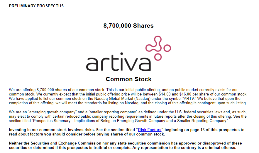 7月15日,总部位于圣地亚哥的临床阶段细胞疗法开发商Artiva Biotherapeutics公布了有关其首次公开募股(IPO)的更多细节:Artiva计划出售870万股股票,每股价格在14美元至16美元之间,拟通过IPO筹集大约1.16亿美元(约8.4亿元),并可能在本周以股票代码“ARTV”上市。如果按每股15美元定价,公司预计在承销商行使购买额外130万股的选择权后,最高可筹集1.35亿美元(约9.8亿元)。