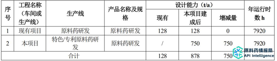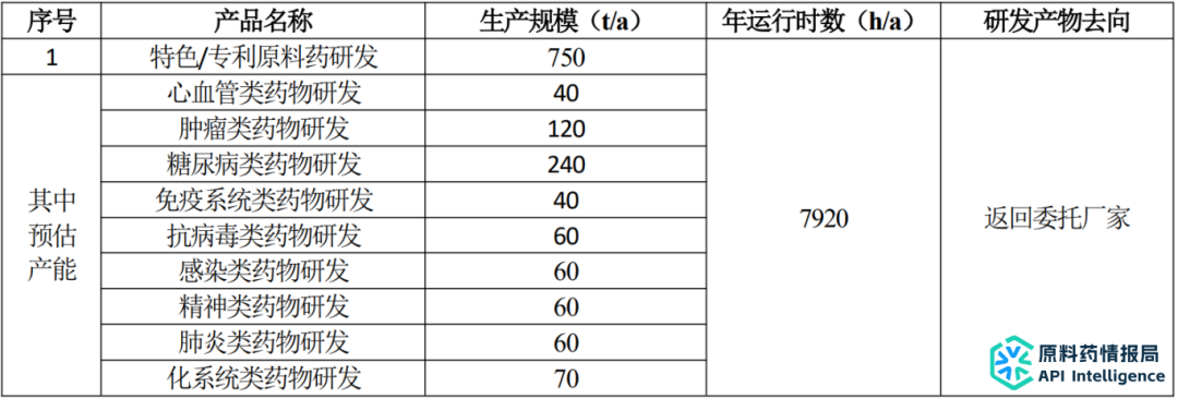 建设内容:本项目建设15个研发车间(其中14个研发生产车间、1个清洗车间),购置反应釜、冷冻机、空压机、离心机等主要设备,配套建设研发楼(即为生产综合楼)、甲类仓库、罐区、事故池、行政综合楼、食堂及停车场等辅助设施;形成特色/专利原料药研发能力750吨/年(本项目一次建设,不分期建设)。