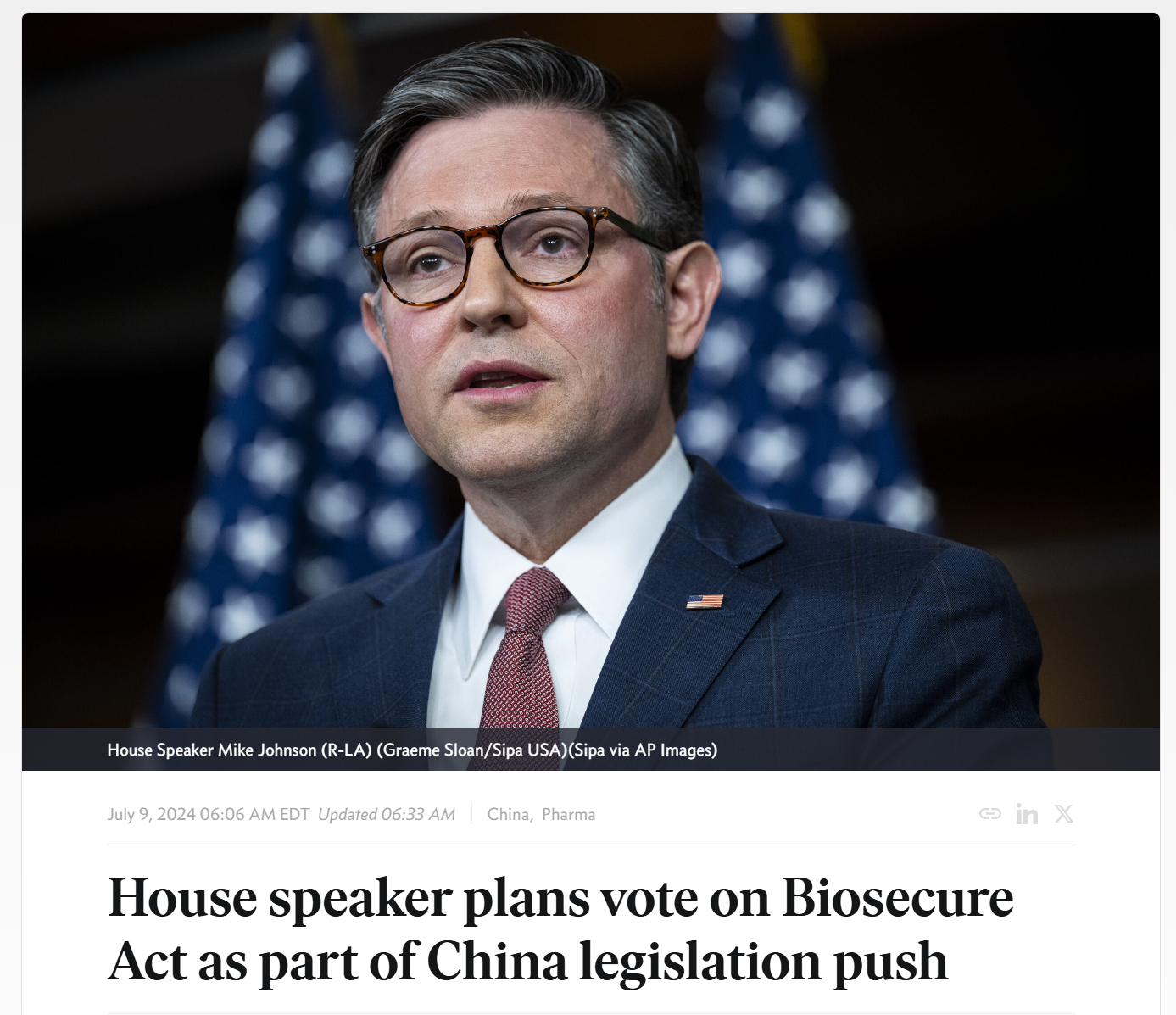 而《生物安全法案》被列为其与中国相关的立法议程中的优先事项。尽管《生物安全法案》在6月份未能获得足够的支持以纳入国防部的必须通过的支出法案中,但在今年3月,一个参议院委员会已经推动了一项与众议院版本相似的法案,但目前还不清楚参议院多数党领袖查克·舒默(民主党-纽约州)是否会将该法案提上议程。