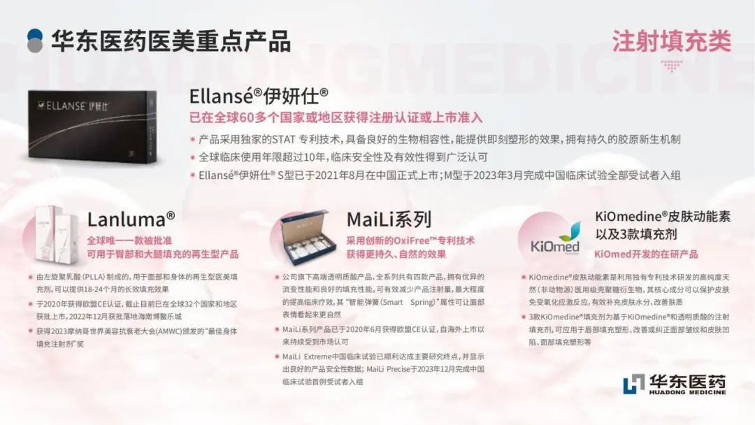 此外,今年5月份华东医药披露了含利多卡因玻尿酸产品MaiLi Precise、再生医美填充剂Ellansé®伊妍仕®S型以及Lanluma®在国内最新临床进展,展现出了极大的商业化潜力。