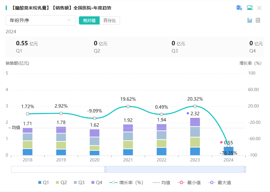 糠酸莫米松乳膏是一种中强效的外用糖皮质激素,适用于湿疹、神经性皮炎、异位性皮炎等。据药融云数据库显示,糠酸莫米松乳膏在2023年全国院内市场销售额超2亿元,同比增长达20.32%。