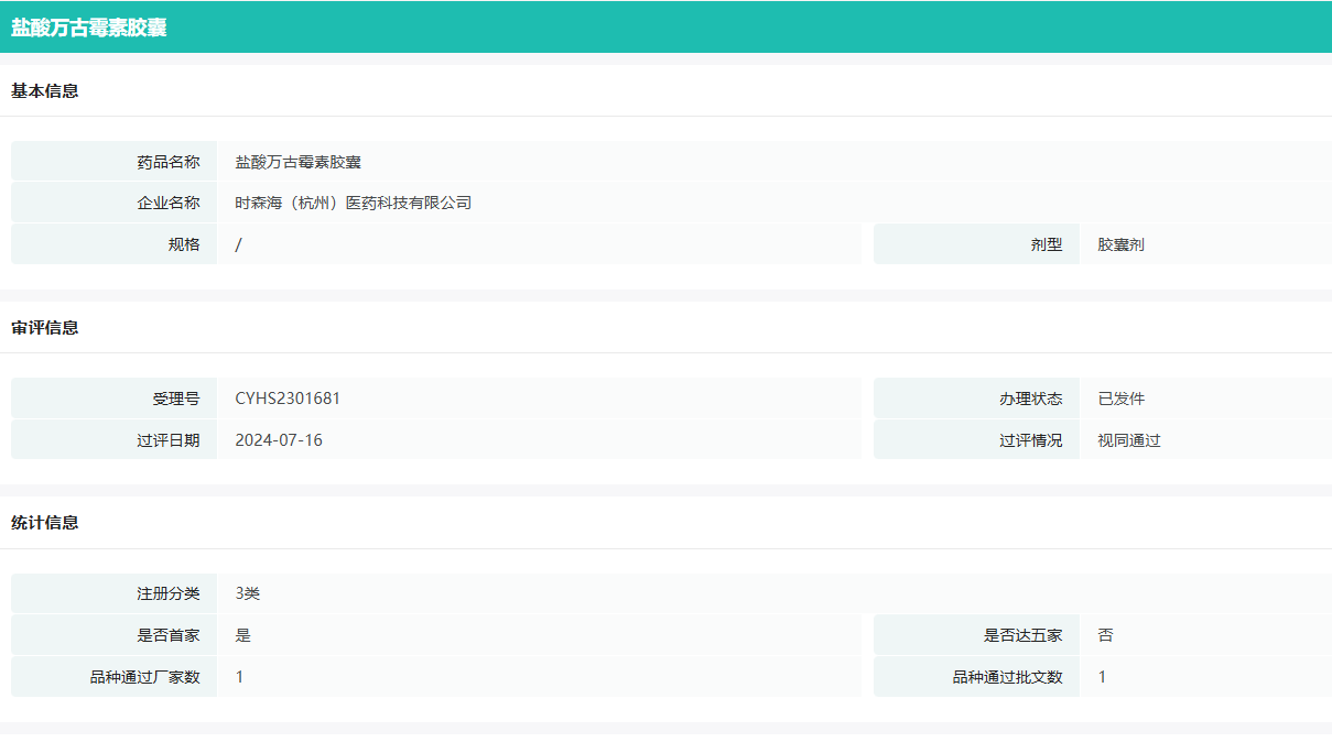 2023年7月,时森海的盐酸万古霉素胶囊被CDE纳入优先审评;今年7月,该产品正式获得NMPA批准上市,从申请受理到获得批准仅用了379天。