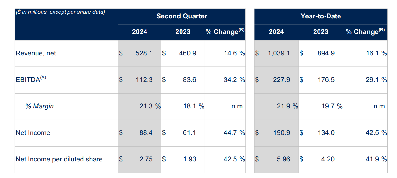 7月24日,海外CRO龙头Medpace公布2024年第二季度业绩:2024 H1总营收10.39亿美元(75.56亿元),同比增长16.1%。其中,第二季度营收为5.28亿美元(38.4亿元),同比增长14.6%,订单积压转化率为18.2%;净利润为8840万美元(6.4亿元),同比增长44.7%;息税折旧摊销前利润(EBITDA)为1.123亿美元,同比增长34.2%,息税折旧摊销前利润率为21.3%。