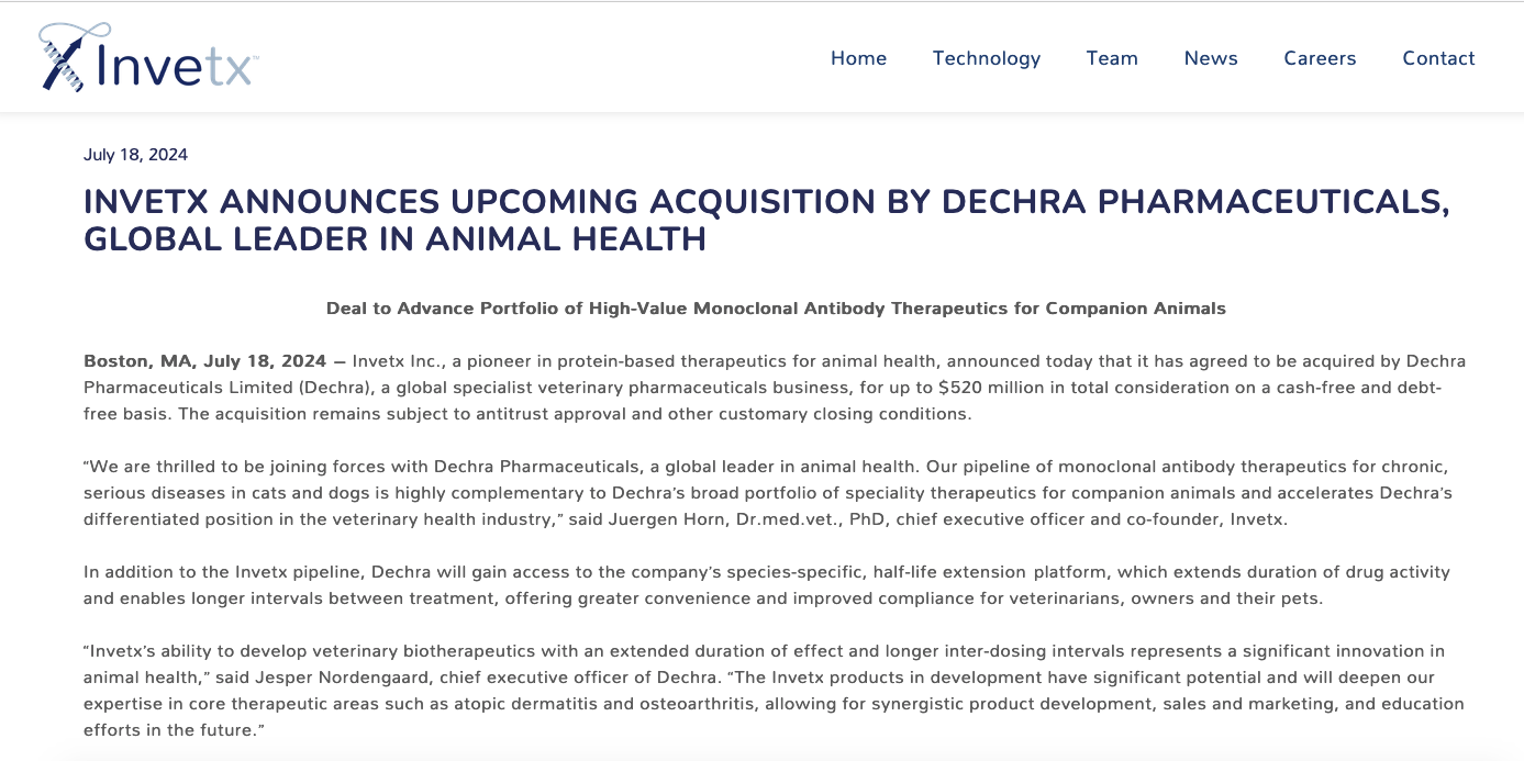 https://www.invetx.com/invetx-announces-upcoming-acquisition-by-dechra-pharmaceuticals-global-leader-in-animal-health/;