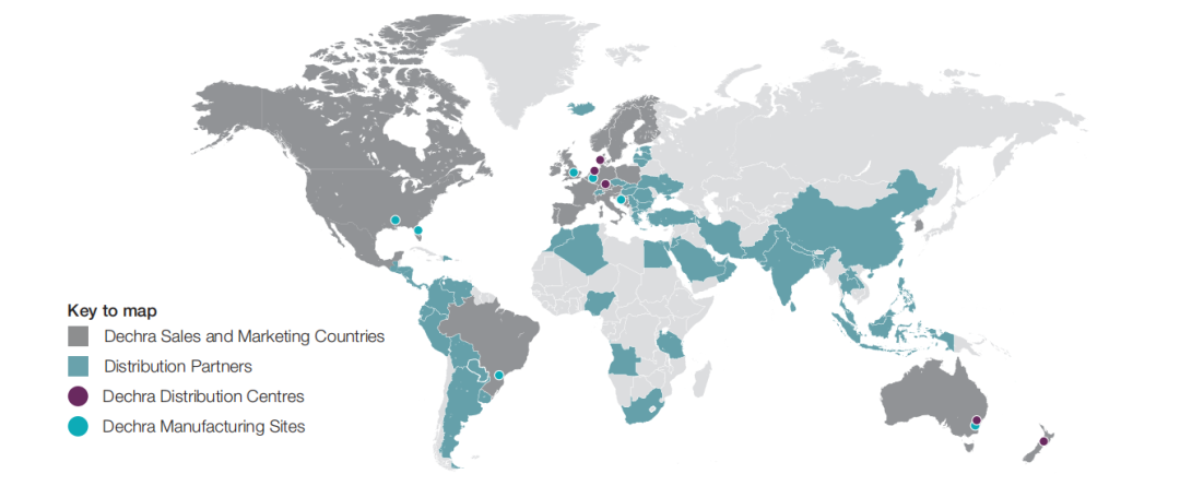 药融云数据显示:英国老牌兽药公司Dechra pharmaceuticals(简称Dechra)成立于1997年,是一家全球专业从事兽药及其相关产品研发、生产与销售的生物制药公司,公司的产品主要分为CAP(伴侣动物产品)、FAP(食品动物产品)、马产品和营养类产品四类。当前Dechra在25个国家拥有自己的销售和营销组织,并通过分销商或营销合作伙伴在全球其他63个国家销售其产品,全球范围内有8个生产基地,总员工超过2000名。以下是Dechra在全球范围内的销售和营销分布图参考: