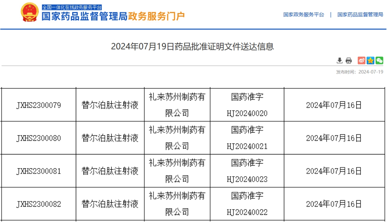 7月19日,据NMPA官网最新公示,礼来(Eli Lilly and Company)公司申报的替尔泊肽注射液(tirzepatide)新适应症上市申请已获得批准。用于在低热量饮食和增加运动基础上改善成人肥胖或伴有至少一种体重相关合并症的超重患者长期体重管理。