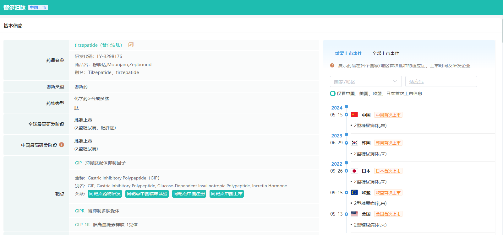 2022年5月,Tirzepatide首次获FDA批准上市,用于治疗2型糖尿病。今年,替尔泊肽在华获批上市,用于治疗2型糖尿病。