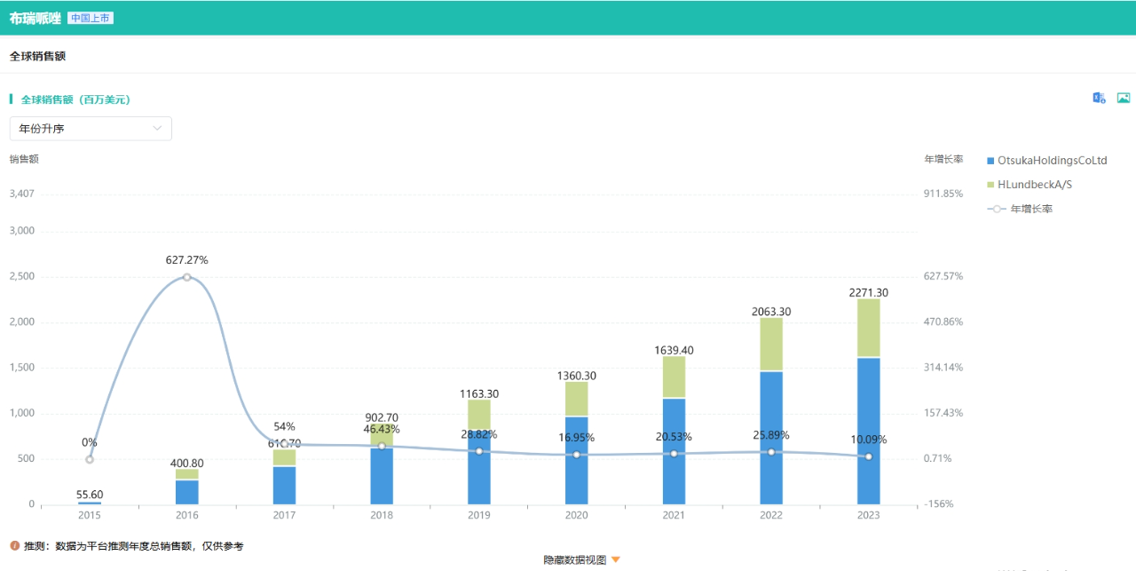 布瑞哌唑由丹麦灵北制药和日本大冢制药株式会社共同研发。是一种非典型抗精神病小分子药物,可调节多种受体的血清素-多巴胺活性,用于治疗重度抑郁症(MDD)、精神分裂症等。据药融云全球药物研发数据库显示,灵北制药/大冢制药的布瑞哌唑在2023年全球销售额超过22亿美元。