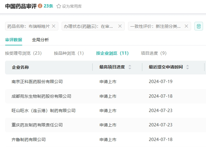 在国内市场,大冢制药于2022年12月首次提交布瑞哌唑片上市申请获受理,并于2024年6月获批进口。目前布瑞哌唑片暂无国内药企获批,然而首仿争夺战激烈,成都苑东生物制药、重庆药友制药、齐鲁制药、湖南科伦制药等11家药企提交了布瑞哌唑片的上市申请,均未获批,若重庆药友制药顺利获批,有望后来者居上。