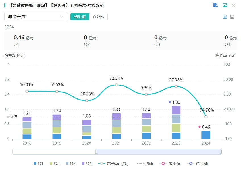 盐酸依匹斯汀胶囊是口服组胺H1受体拮抗剂,适用于治疗过敏性鼻炎、荨麻疹、湿疹、皮炎、皮肤瘙痒症、痒疹、伴有瘙痒的寻常型银屑病,还可用于过敏性支气管哮喘的防治。据药融云数据库显示,盐酸依匹斯汀胶囊在2023年全国院内市场销售额为1.8亿元,同比增长达27.38%。