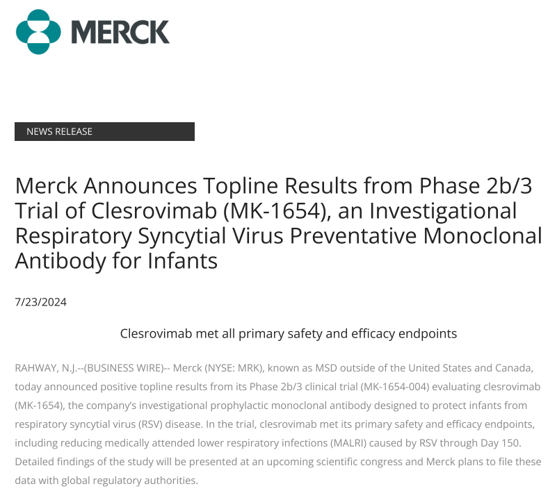 7月24日,默沙东宣布,其在研呼吸道合胞病毒(RSV)预防性单抗clesrovimab(MK-1654)在2b/3期临床试验中取得积极结果。该抗体旨在保护婴儿免受RSV疾病的侵袭。在试验中,clesrovimab达到了试验的主要安全性和有效性终点,包括在第150天前减少由RSV引起的需要医疗干预的下呼吸道感染(MALRI)。该研究的详细结果将在即将召开的科学大会上公布,默沙东计划向全球监管机构提交这些数据。