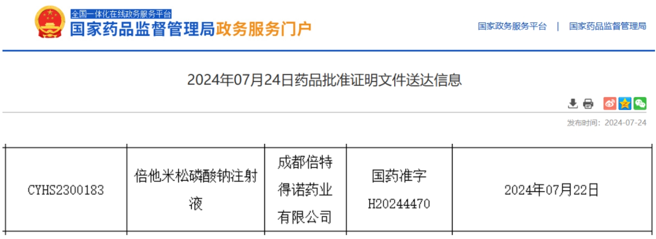 7月24日,据NMPA官网最新公示,倍特药业旗下公司--成都倍特得诺药业提交的3类仿制药倍他米松磷酸钠注射液获批并视同过评。据药融云数据库显示,今年以来,倍特药业(含子公司)有26款品种过评。