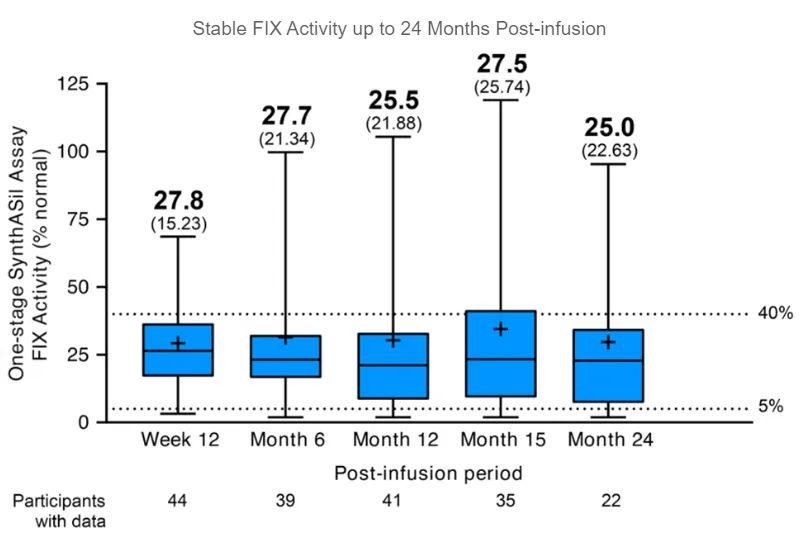 Durveqtix的获批基于关键性BENEGENE-2临床研究的结果。该研究是一项开放标签、单臂III期临床试验,评估Durveqtix在FIX活性≤2%的18至65岁成年男性中重度血友病B患者中的疗效和安全性。主要目标是对比基因疗法组与常规FIX预防替代疗法组的年化出血率(ABR)。研究共纳入45名参与者,他们在接受单次静脉输注Durveqtix(剂量为5x10¹¹ vg/kg体重)前已完成至少六个月的常规FIX预防治疗。研究参与者将被随访总计15年,以了解Durveqtix的长期安全性和有效性。
