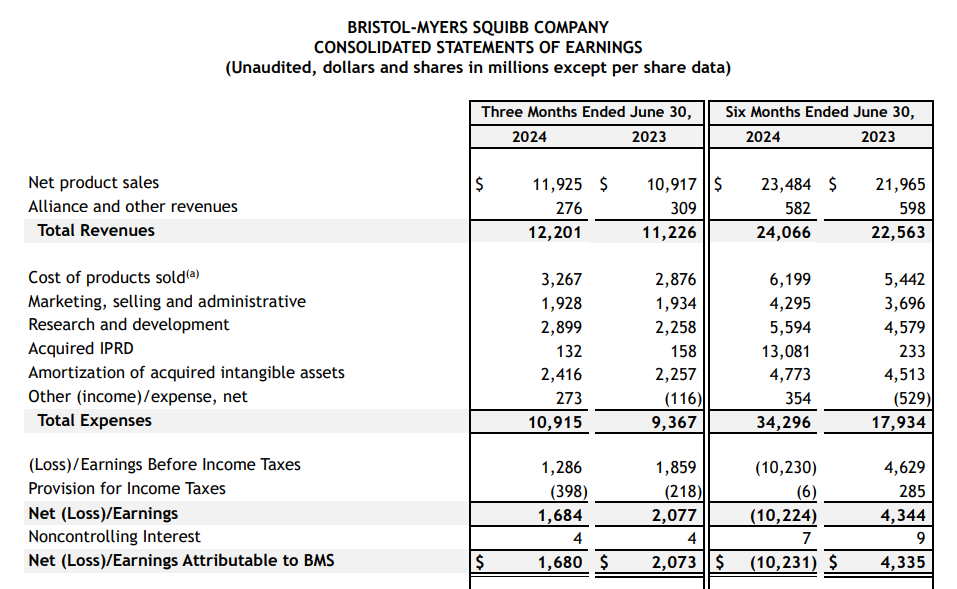 7月26日,BMS公布2024年H1业绩,上半年总营收240.66亿美,同比增长7%;该公司销售成本为61.99亿美元,同比增长14%;研发投入55.94亿美元,同比增长22%。其中Q2营收为122.01亿美元,同比增长9%。由于其投资组合的整体表现出色,财报发出后其股价上涨了9%。