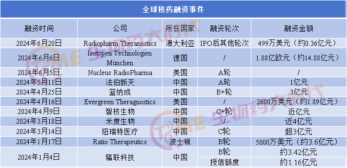 随着诺华Pluvicto的成功,加上国家政策的支持,核药赛道开始受到资本追捧,2024年以来全球核药市场投融资也呈现出火热态势。2024年上半年约有11家核药企业获得融资,融资金额超37亿元。