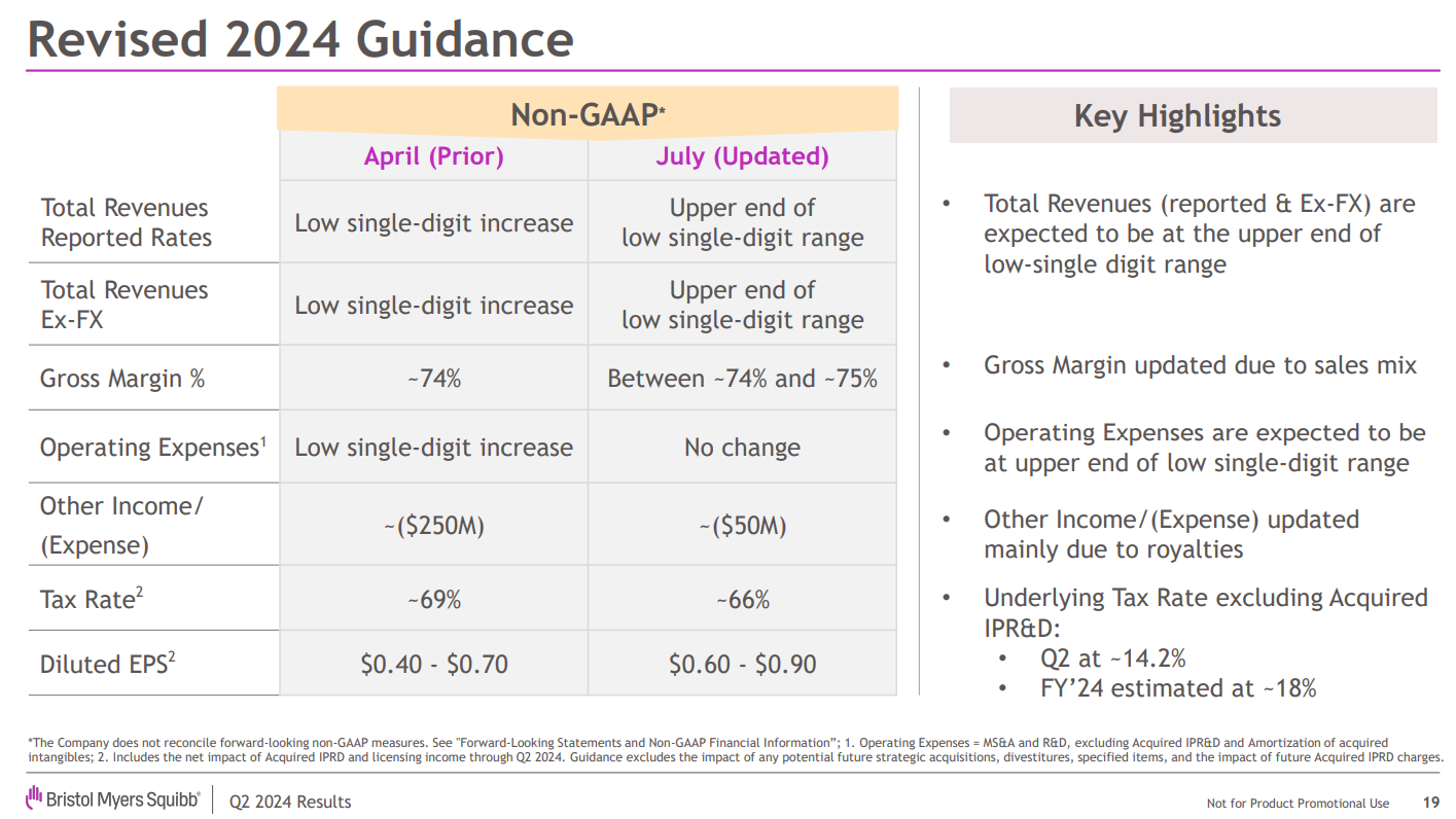 百时美施贵宝还小幅提高了2024年收入财务指引,将营收增长率由此前预测的低个位数增长调整为低个位数范围的上限。
