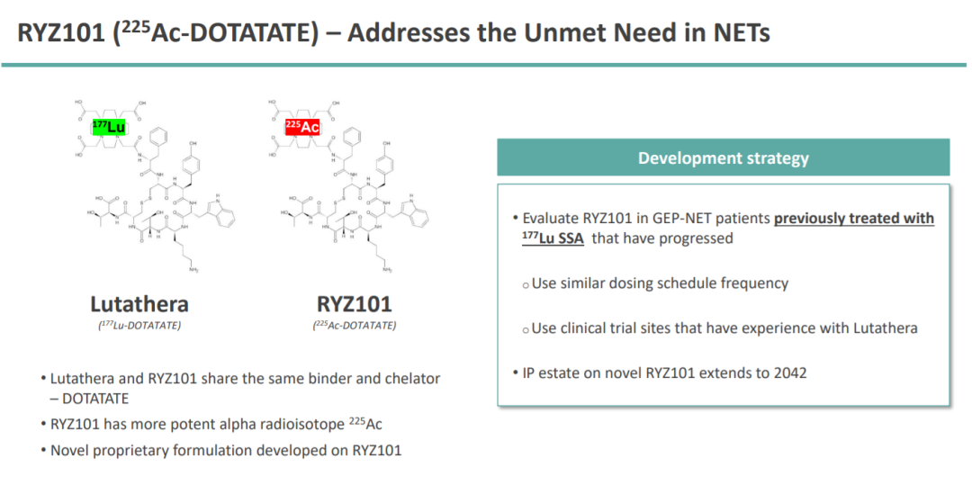 RYZ101是一款靶向放射性治疗药物,可以向过表达生长抑素受体(SSTR)的肿瘤递送强效α粒子放射性同位素锕-225。RYZ101以诺华的Lutathera®作对标,Lutathera为β核素Lu-177,RYZ101核素为杀伤力更强、射程更短的α核素Ac-225。FDA尚未批准基于锕的放射性药物,如果RYZ101的Ⅲ期临床能获得成功,将有望成为第一个获批的锕-225放射性药物疗法。