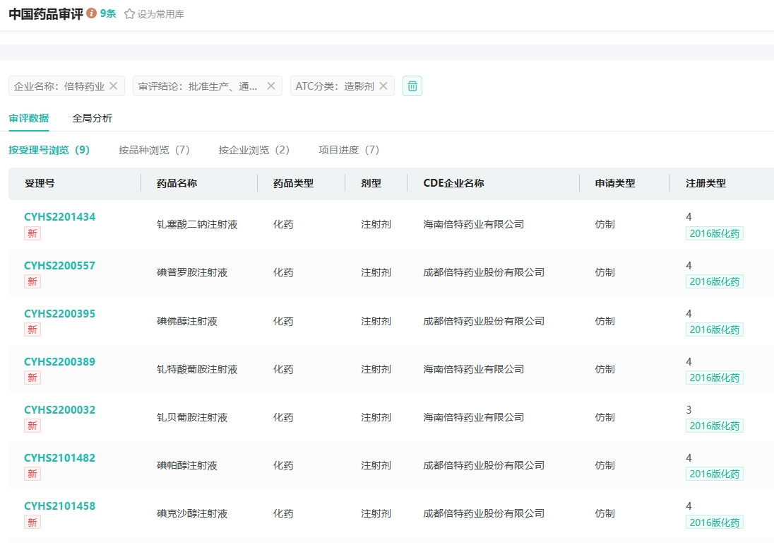7月30日,据CDE官网显示,成都倍特药业提交的4类仿制化药碘比醇注射液上市申请已获受理。目前,倍特药业(含子公司)有4款造影剂品种报产在审,猛攻百亿市场。