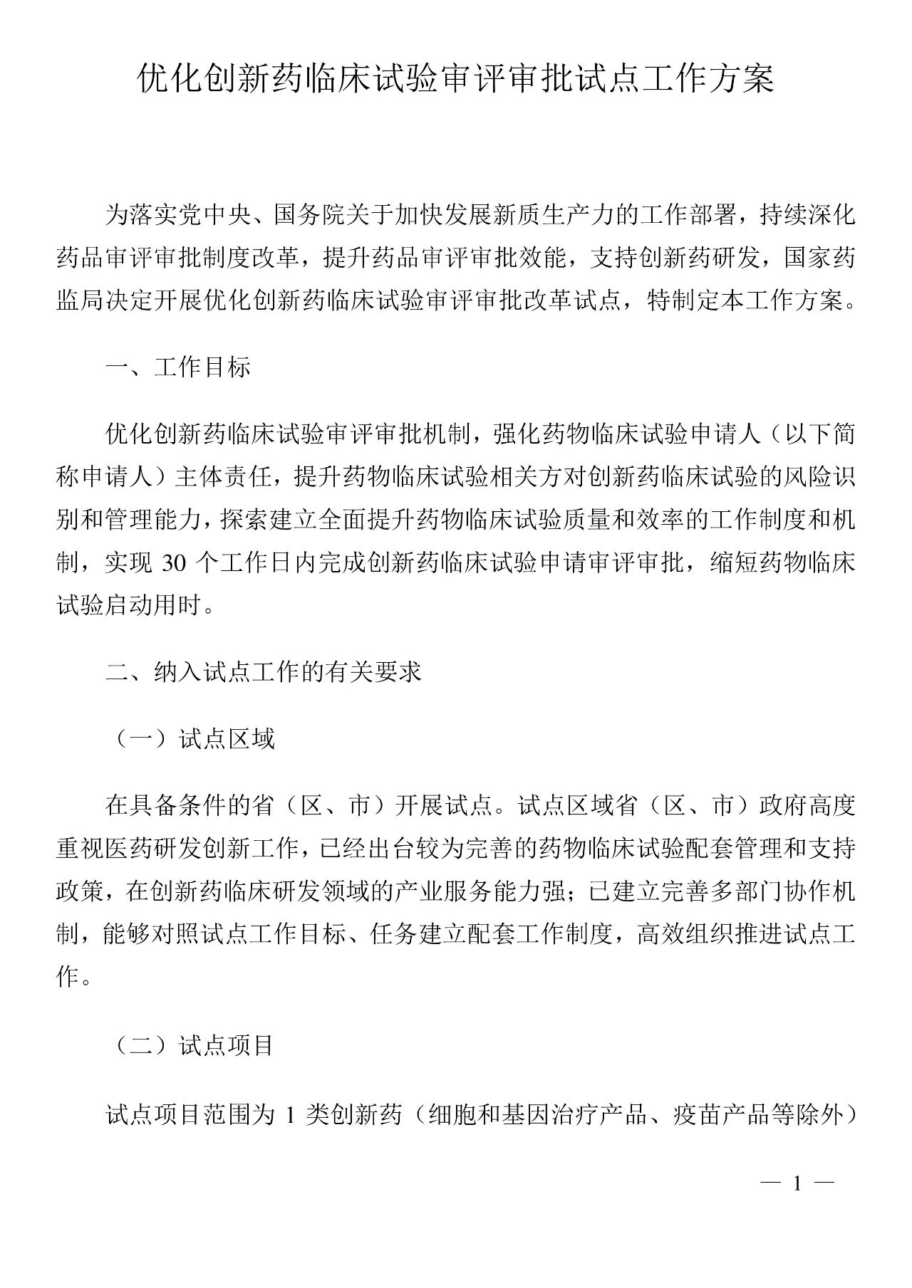 为落实党中央、国务院关于加快发展新质生产力的工作部署,持续深化药品审评审批制度改革,提升药品审评审批效能,支持创新药研发,国家药监局制定了《优化创新药临床试验审评审批试点工作方案》,现印发给你们,请结合实际,认真落实。
