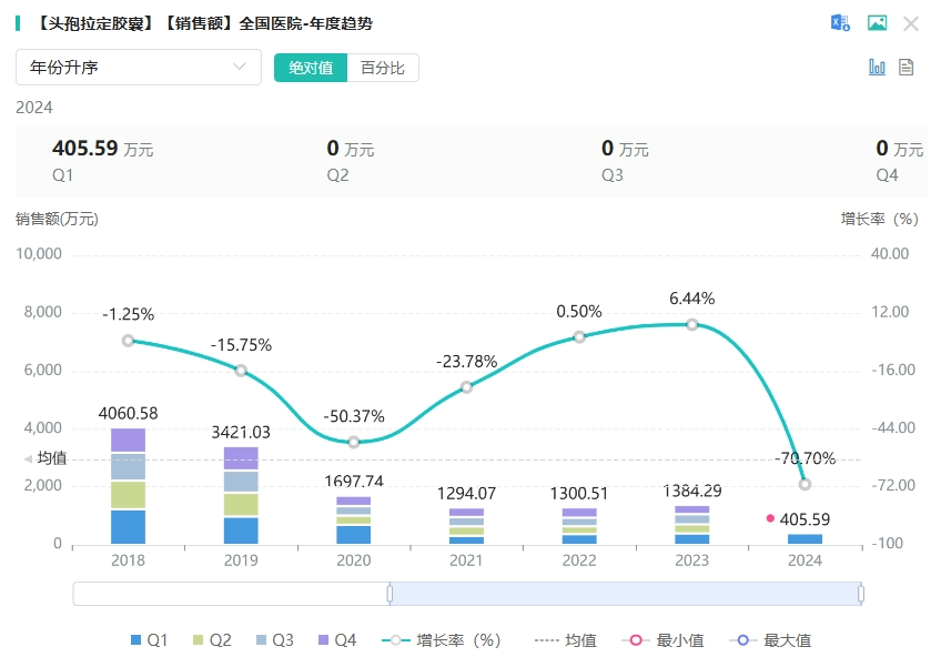 头孢拉定胶囊适用于敏感菌所致急性咽炎、扁桃体炎、中耳炎、支气管炎和肺炎等呼吸道感染,泌尿生殖道感染及皮肤软组织感染等。本品为口服制剂,不宜用于严重感染。据药融云数据库显示,头孢拉定胶囊在2023年全国院内市场的销售额超1300万元,同比增长达6.44%。