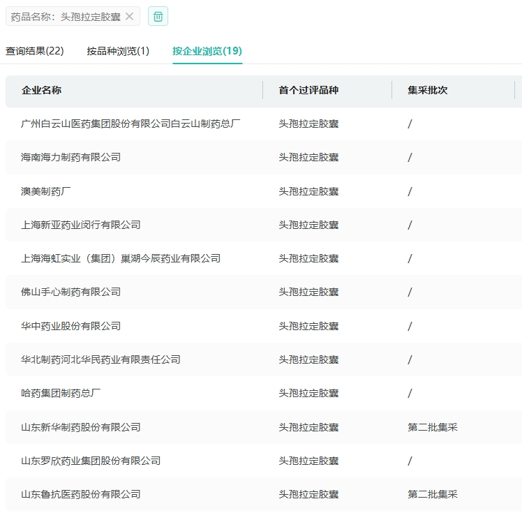 目前,头孢拉定胶囊有悦康药业、山东新华制药、广东恒健制药、哈药集团制药、山东鲁抗医药、石药集团欧意药业、湖南科伦制药、扬子江药业等19家药企过评。
