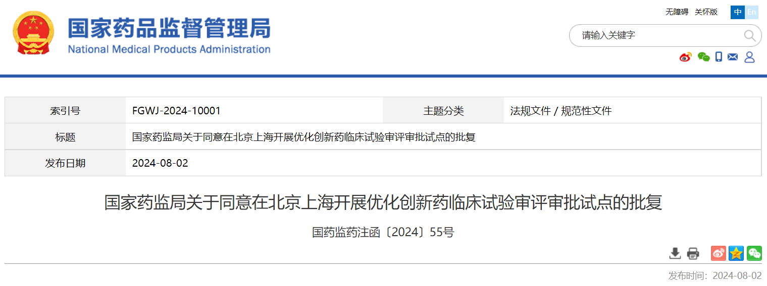 8月2日,国家药监局发布公告,经审核,同意在北京、上海开展优化创新药临床试验审评审批试点。