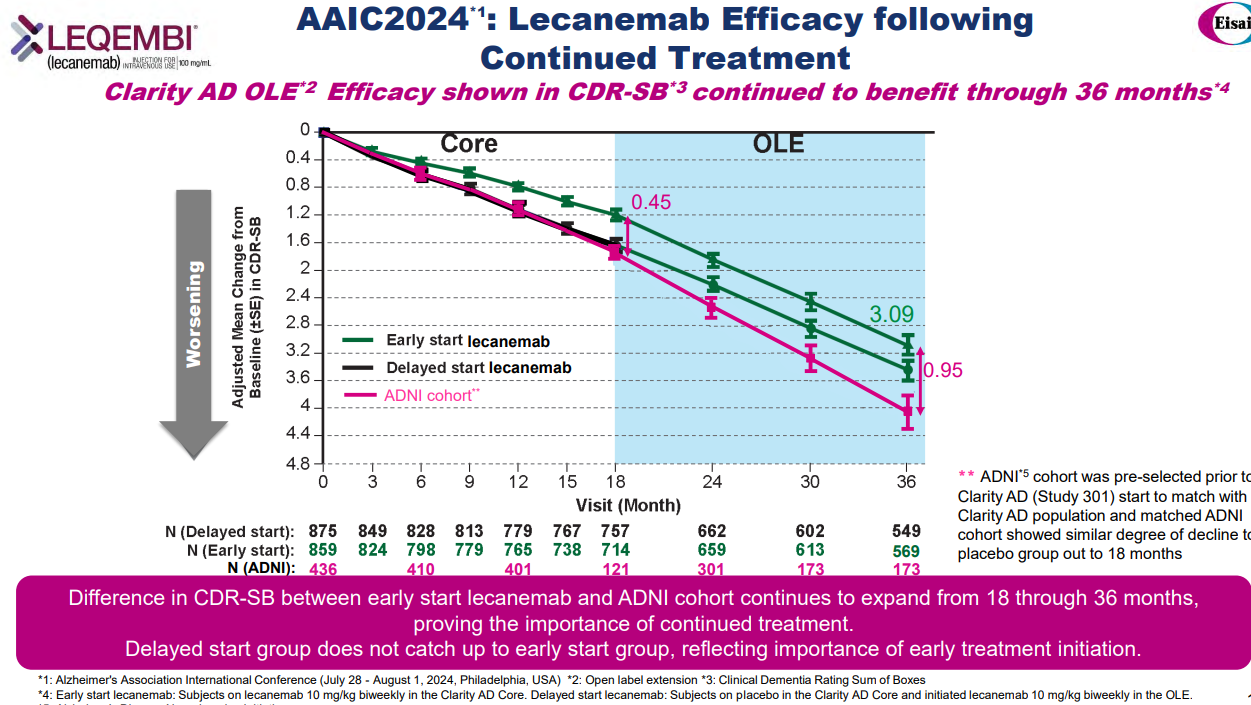 在核心研究和OLE的三年治疗中,与阿尔茨海默病神经影像学倡议(ADNI)组类似患者数据相较,lecanemab将基于CDR-SB的认知衰退幅度平均减少了0.95分。持续三年使用lecanemab治疗未观察到新的安全问题。大多数淀粉样蛋白相关成像异常(ARIA)发生在治疗的首六个月。六个月后,ARIA的发生率较低,与安慰剂组相似。